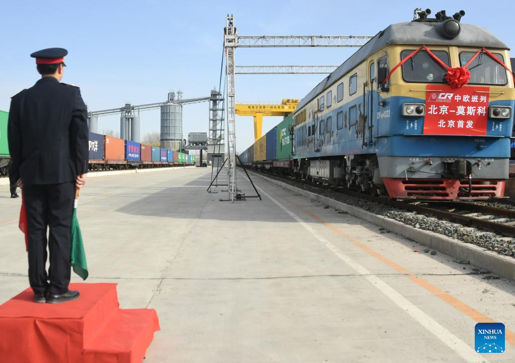 A China-Europe freight train heading for Moscow departs from Mafang railway station in Pinggu District of Beijing, capital of China, on March 16, 2023. A cargo train loaded with 55 containers left Beijing Thursday morning for the Russian capital Moscow, marking the launch of the first direct China-Europe freight train service from the Chinese capital.(Xinhua/Ren Chao)