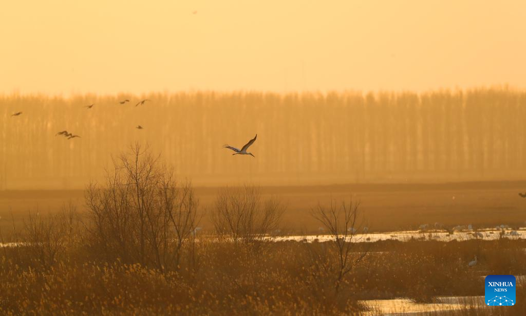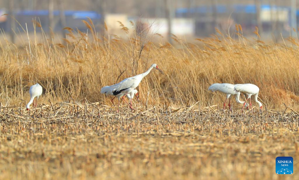 This photo taken on March 15, 2023 shows white cranes at Huanzidong wetland in Faku County, northeast China's Liaoning Province. (Xinhua/Yang Qing)