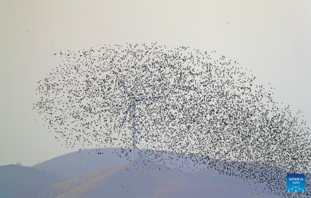 This photo taken on March 15, 2023 shows migrant birds flying in the sky at Huanzidong wetland in Faku County, northeast China's Liaoning Province. (Xinhua/Yang Qing)