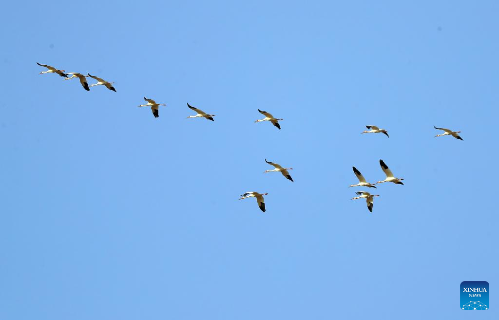 This photo taken on March 15, 2023 shows oriental white storks at Huanzidong wetland in Faku County, northeast China's Liaoning Province. (Xinhua/Yang Qing)