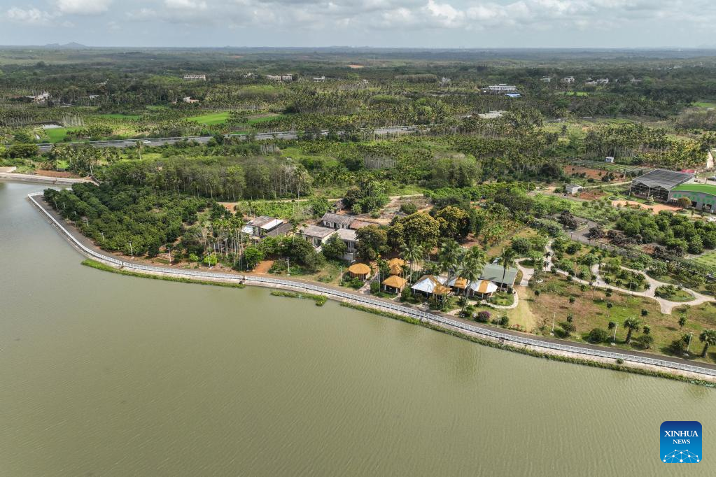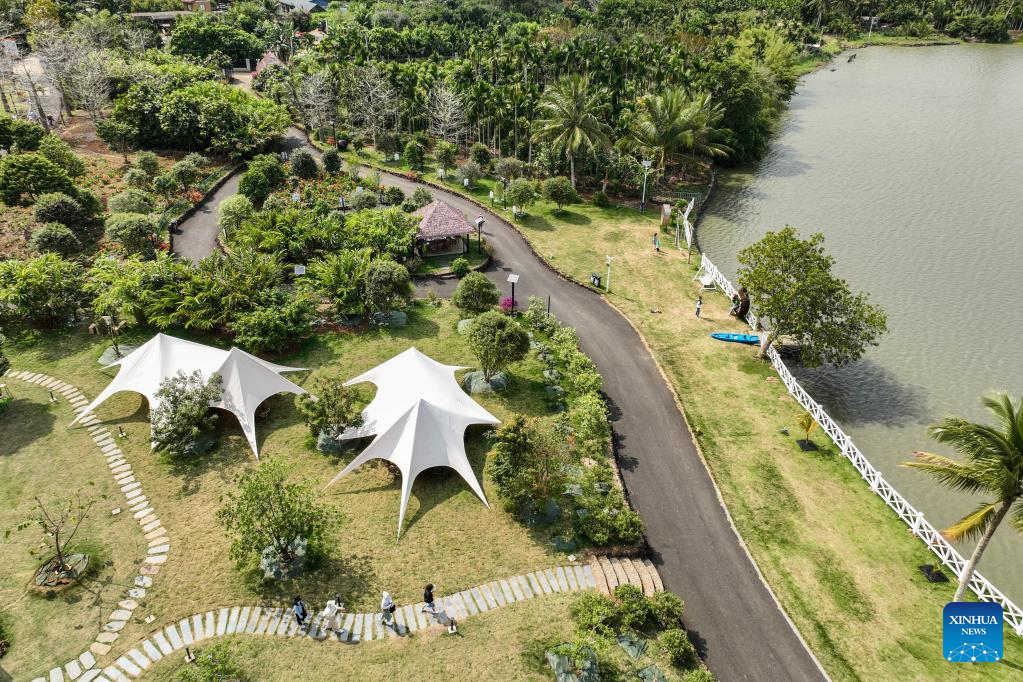 This aerial photo taken on March 15, 2023 shows the view of a scenic spot featuring tropical fruits in Qionghai, south China's Hainan Province, March 15, 2023. As a key project of a pilot zone for international agricultural cooperation in Hainan Province, the scenic spot has introduced more than 500 kinds of tropical fruits from all over the world, which promotes the integrated development of agriculture and tourism. (Xinhua/Zhang Liyun)