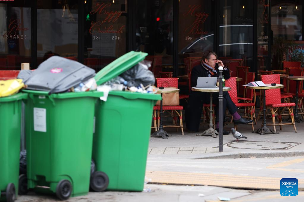 A man takes a drink at a restaurant in front of which piles of garbage are left on the street of Paris, France, March 15, 2023. Garbage is likely to continue accumulating in the capital, since refuse collectors and street cleaners will be on strike until March 20. According to the city hall, some 76,000 tons of garbage are to be collected by Wednesday in Paris. (Xinhua/Gao Jing)