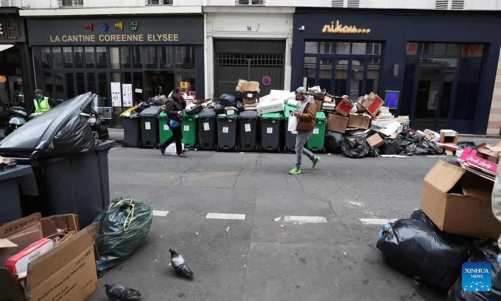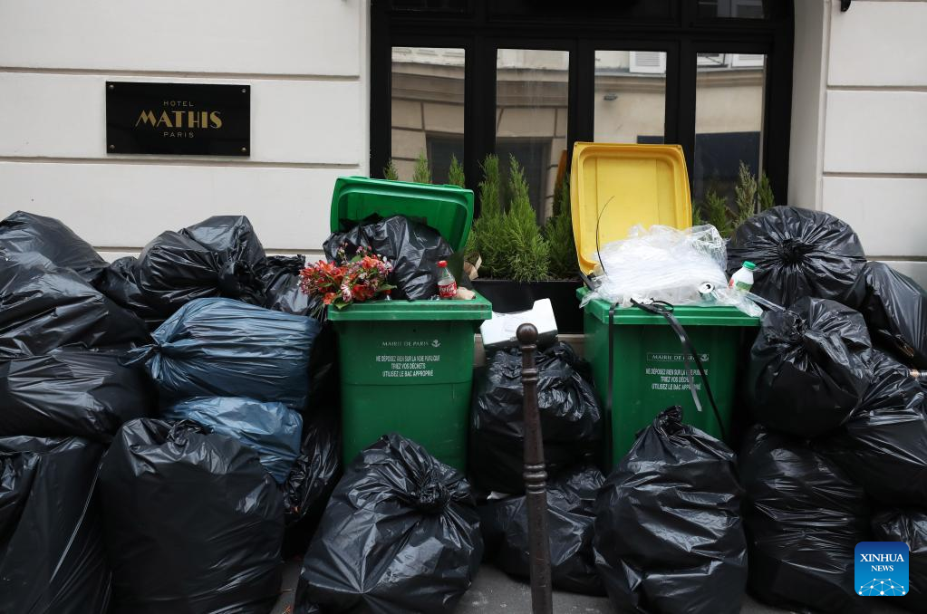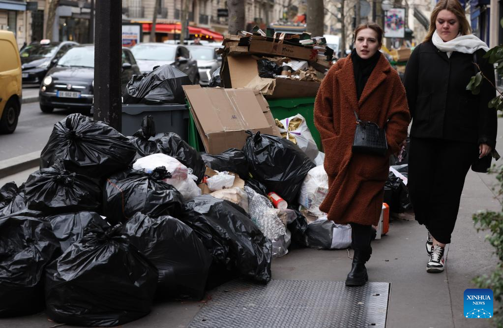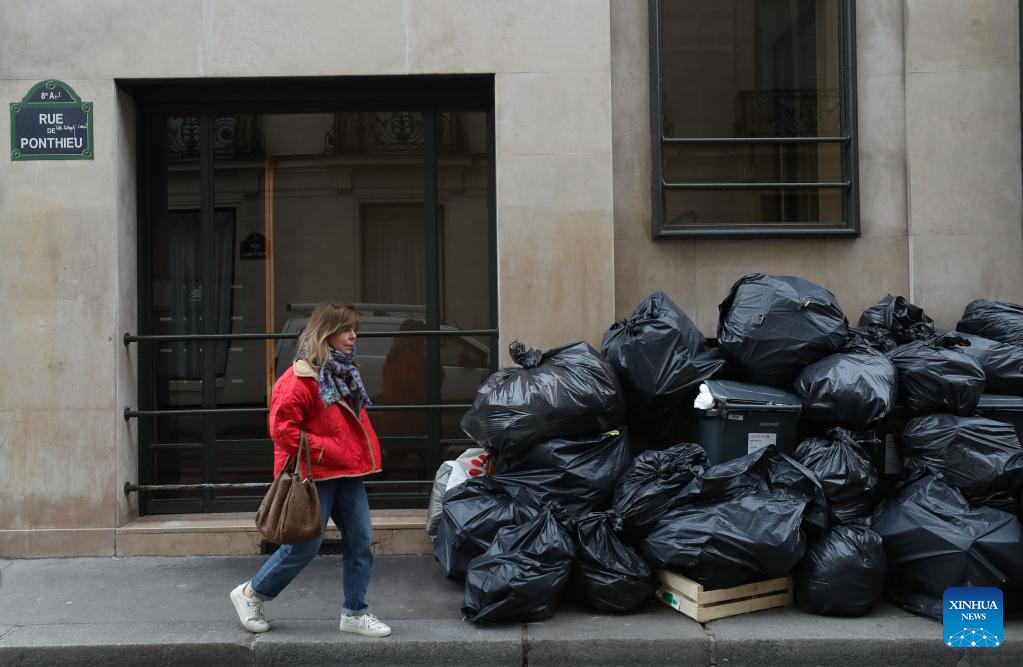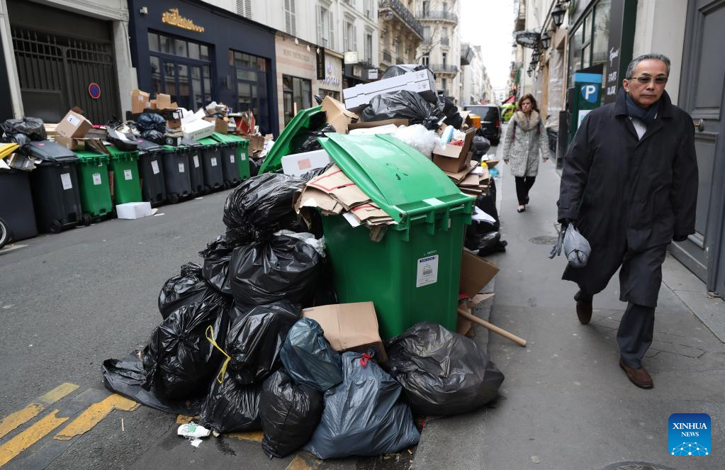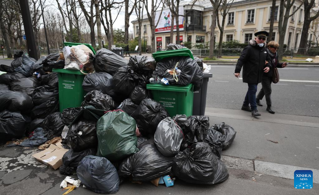Garbage is seen left on the street of Paris, France, March 15, 2023. Garbage is likely to continue accumulating in the capital, since refuse collectors and street cleaners will be on strike until March 20. According to the city hall, some 76,000 tons of garbage are to be collected by Wednesday in Paris. (Xinhua/Gao Jing)