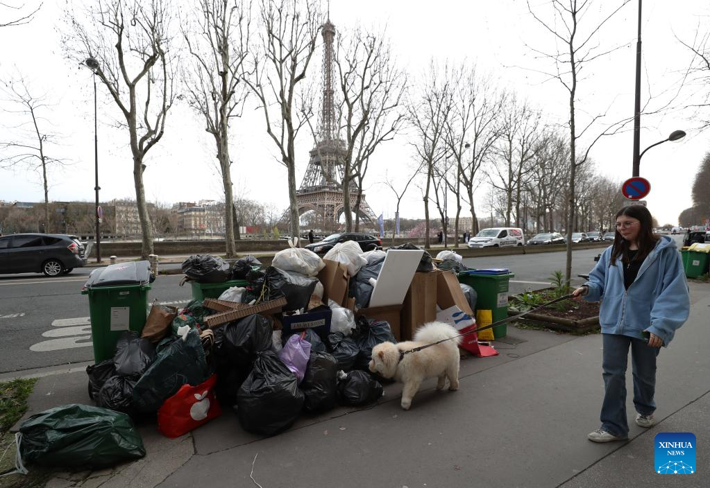 A woman walks past garbage left on the street near the Eiffel Tower in Paris, France, March 15, 2023. Garbage is likely to continue accumulating in the capital, since refuse collectors and street cleaners will be on strike until March 20. According to the city hall, some 76,000 tons of garbage are to be collected by Wednesday in Paris. (Xinhua/Gao Jing)