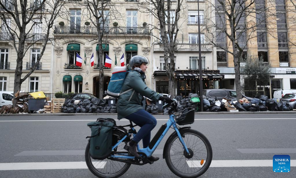A cyclist passes by garbage left on the street of Paris, France, March 15, 2023. Garbage is likely to continue accumulating in the capital, since refuse collectors and street cleaners will be on strike until March 20. According to the city hall, some 76,000 tons of garbage are to be collected by Wednesday in Paris. (Xinhua/Gao Jing)