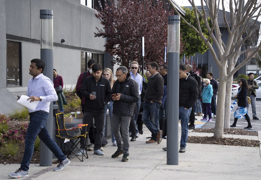 People queue up outside the headquarters of the Silicon Valley Bank (SVB) in Santa Clara, California, the United States, March 13, 2023. (Photo by Li Jianguo/Xinhua)
