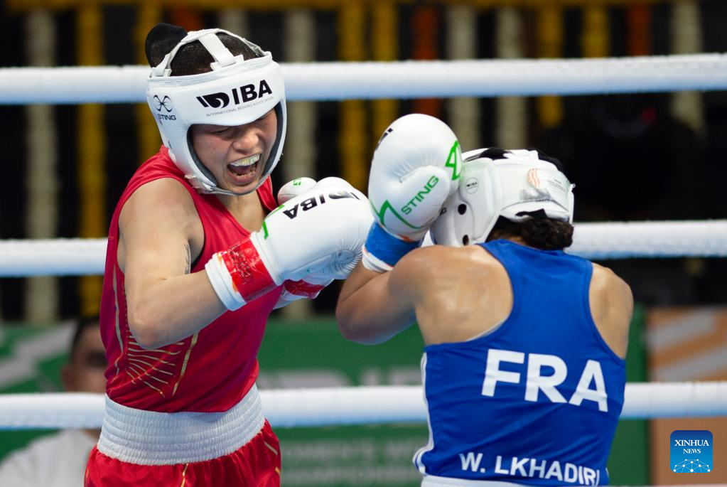Chang Yuan (L) of China competes with Lkhadiri Wassila of France during the elite women's 48-50kg light fly preliminary match at IBA World Women's Boxing Championships 2023 in New Delhi, India, March 16, 2023. (Xinhua/Javed Dar)