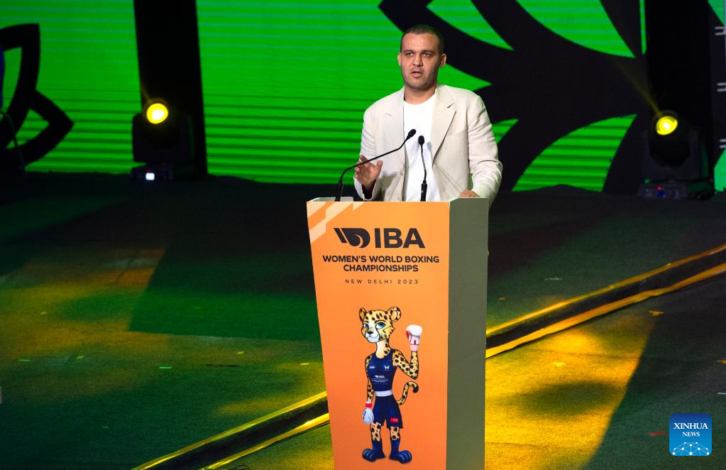 International Boxing Association (IBA) president Umar Kremlev addresses the opening ceremony of the IBA World Women's Boxing Championships 2023 in New Delhi, India, March 15, 2023. (Xinhua/Javed Dar)