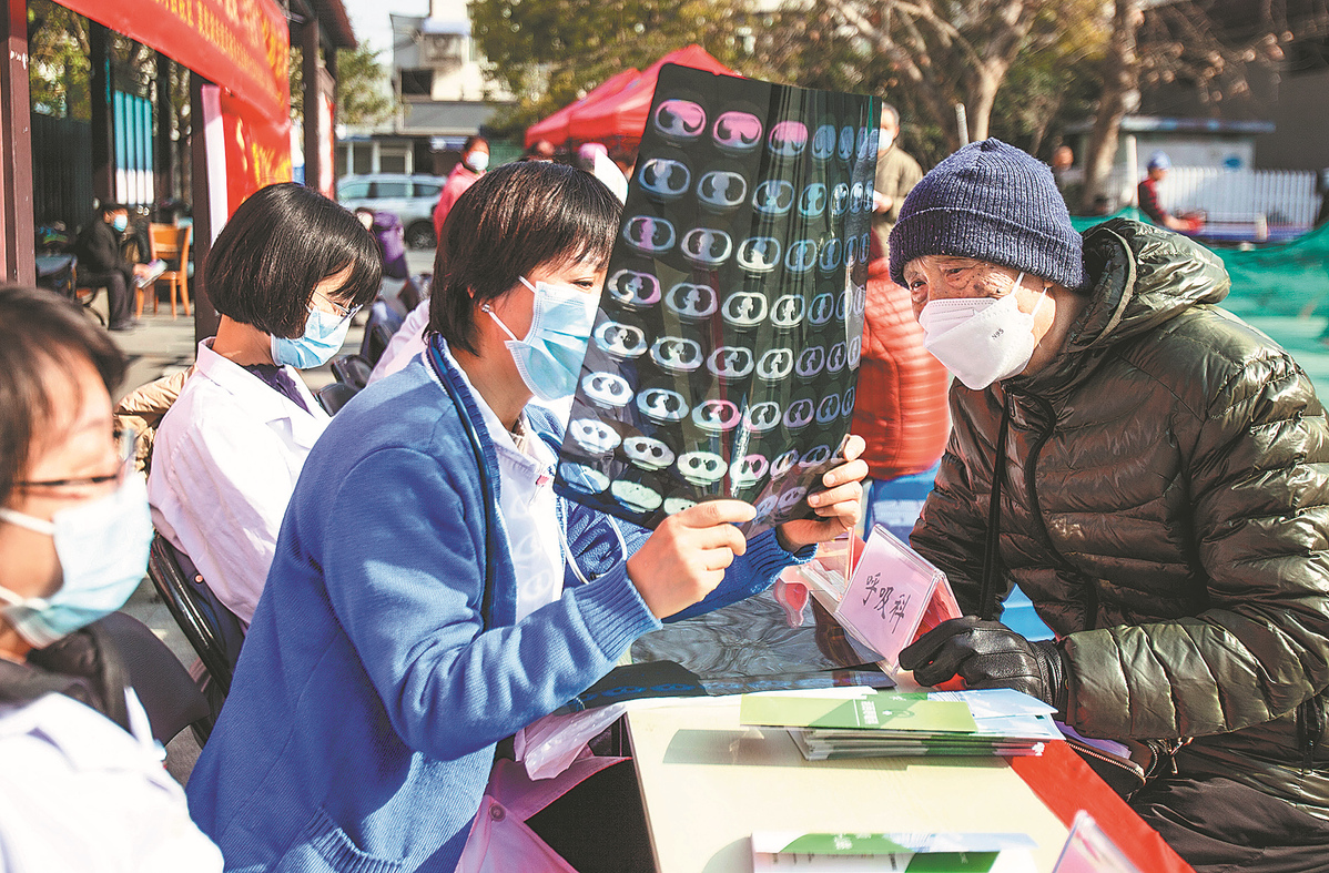A medical worker explained the result of a CT scan to a patient during a free clinic event in Nanjing, Jiangsu province, in March. [Photo/China Daily]