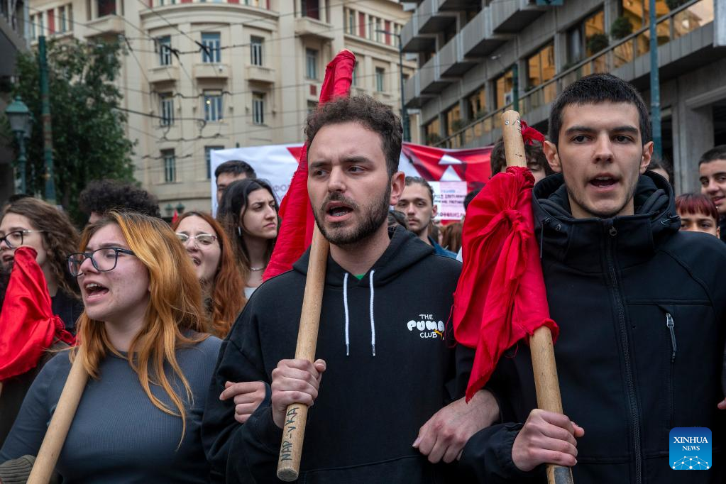 People take part in a demonstration in Athens, Greece, on March 16, 2023. Greece's public services, including transport, were paralyzed on Thursday by a 24-hour nationwide general strike called by labor unions over the deadly train accident last month. (Xinhua/Marios Lolos)