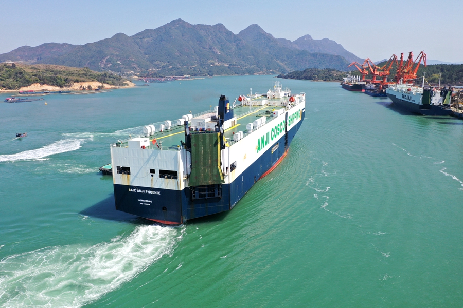 Photo shows a large ro-ro ship bound for Mexico leaving Sanduao Port in Ningde, southeast China’s Fujian Province. (Photo/People’s Daily Online)