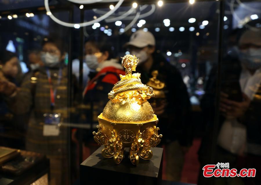 A gold artifact is on display at the China International Jewelry Fair in Beijing, March 16, 2023. (Photo: China News Service/Zhao Jun)