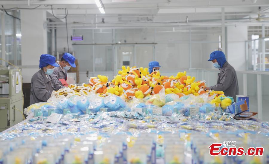 Workers pack plush toys of Hangzhou 2022 Asian Games mascot at a factory in Hangzhou, east China's Zhejiang Province, March 16, 2023. (Photo: China News Service/Qian Chenfei)