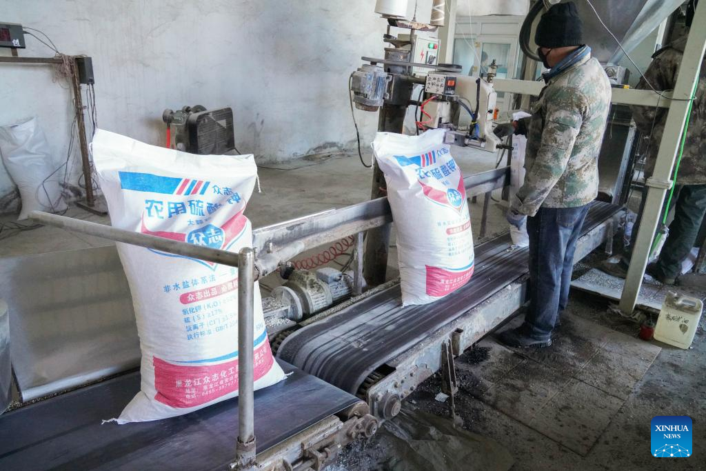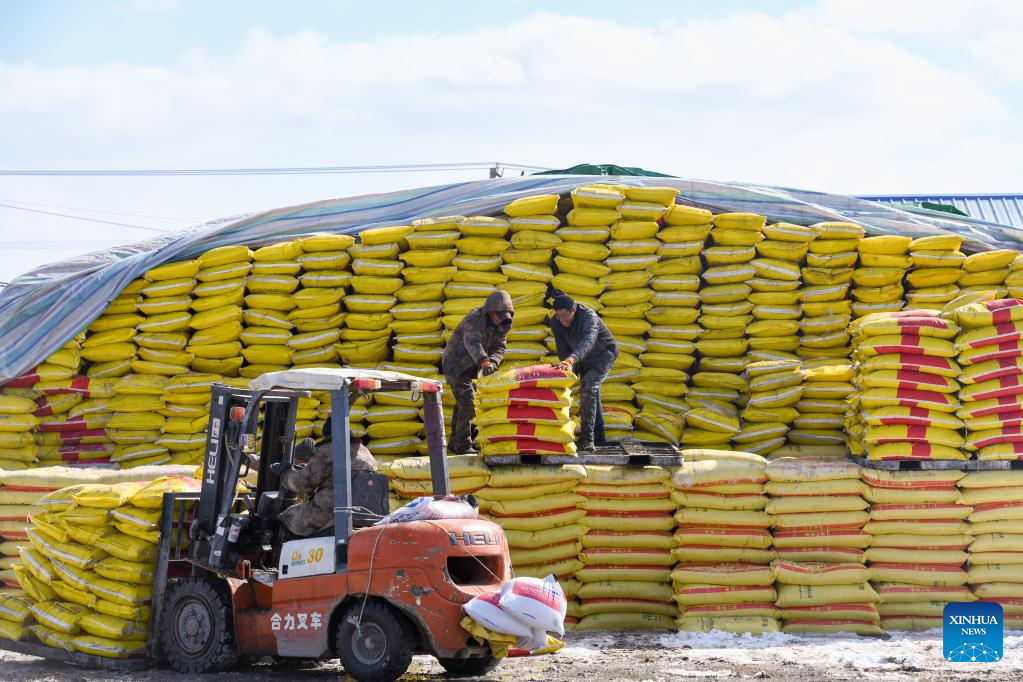Staff members of the Jianshe Farm Co., Ltd. of Beidahuang Group transport materials at the company's fertilizer blending center in Heihe, northeast China's Heilongjiang Province, March 16, 2023. Jianshe Farm Co., Ltd. of Beidahuang Group has been busy preparing for spring ploughing recently. All the farm's farming machinery is now ready for production on more than 300,000 mu (20,000 hectares) of farm fields. (Xinhua/Wang Song)