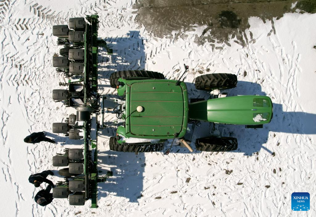 This aerial photo taken on March 16, 2023 shows staff members of the Jianshe Farm Co., Ltd. of Beidahuang Group maintaining a farming machine in Heihe, northeast China's Heilongjiang Province. Jianshe Farm Co., Ltd. of Beidahuang Group has been busy preparing for spring ploughing recently. All the farm's farming machinery is now ready for production on more than 300,000 mu (20,000 hectares) of farm fields. (Xinhua/Wang Song)