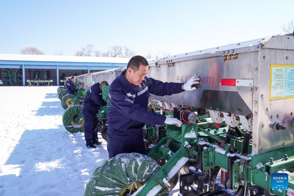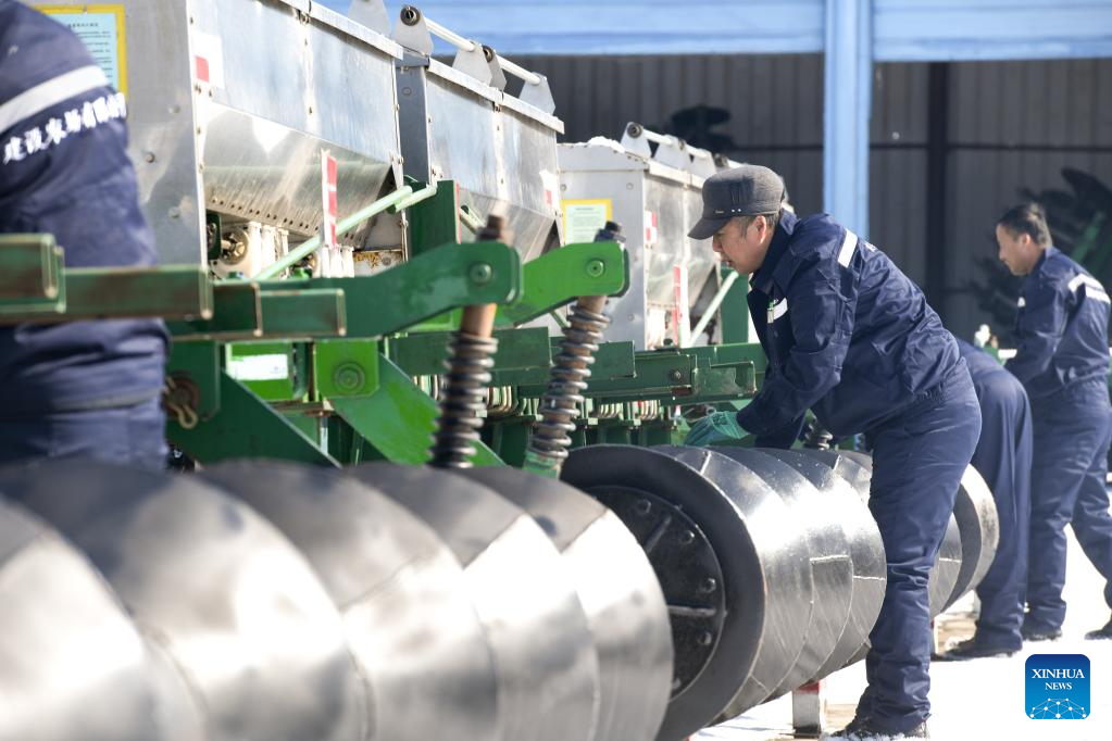 Staff members of the Jianshe Farm Co., Ltd. of Beidahuang Group maintain farming machines in Heihe, northeast China's Heilongjiang Province, March 16, 2023. Jianshe Farm Co., Ltd. of Beidahuang Group has been busy preparing for spring ploughing recently. All the farm's farming machinery is now ready for production on more than 300,000 mu (20,000 hectares) of farm fields. (Xinhua/Wang Song)
