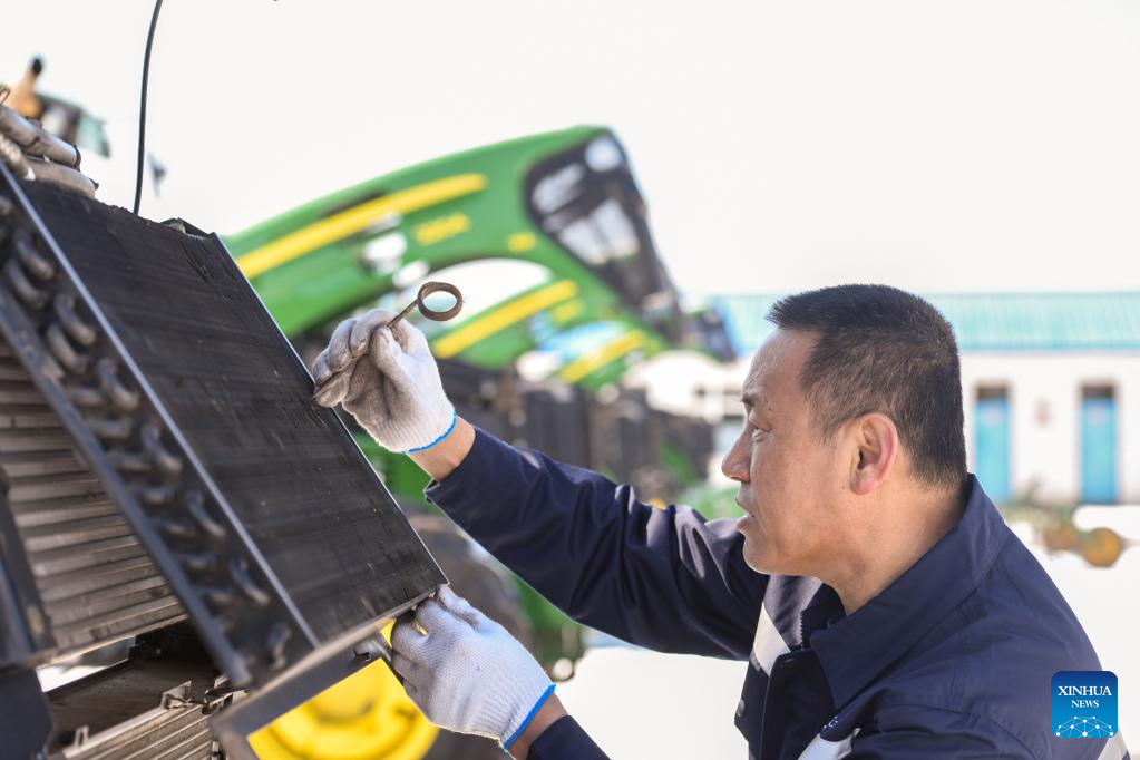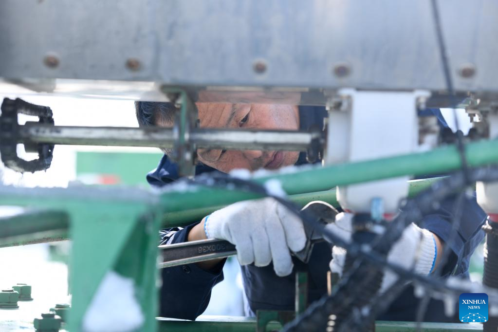 A staff member of the Jianshe Farm Co., Ltd. of Beidahuang Group maintains a farming machine in Heihe, northeast China's Heilongjiang Province, March 16, 2023. Jianshe Farm Co., Ltd. of Beidahuang Group has been busy preparing for spring ploughing recently. All the farm's farming machinery is now ready for production on more than 300,000 mu (20,000 hectares) of farm fields. (Xinhua/Wang Song)