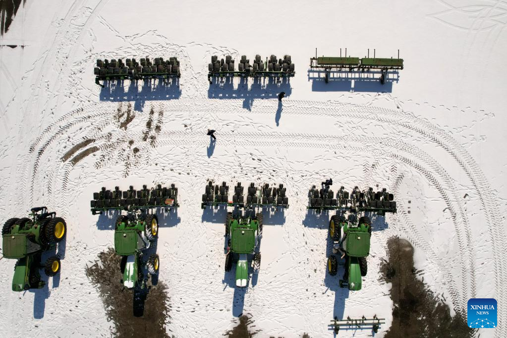This aerial photo taken on March 16, 2023 shows staff members of the Jianshe Farm Co., Ltd. of Beidahuang Group maintaining farming machines in Heihe, northeast China's Heilongjiang Province. Jianshe Farm Co., Ltd. of Beidahuang Group has been busy preparing for spring ploughing recently. All the farm's farming machinery is now ready for production on more than 300,000 mu (20,000 hectares) of farm fields. (Xinhua/Wang Song)