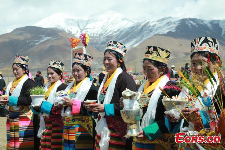 Villagers take part in a ceremony marking the start of this year's plowing season in Lhasa, southwest Tibet Autonomous Region, March 16, 2023. (Photo/China News Service)