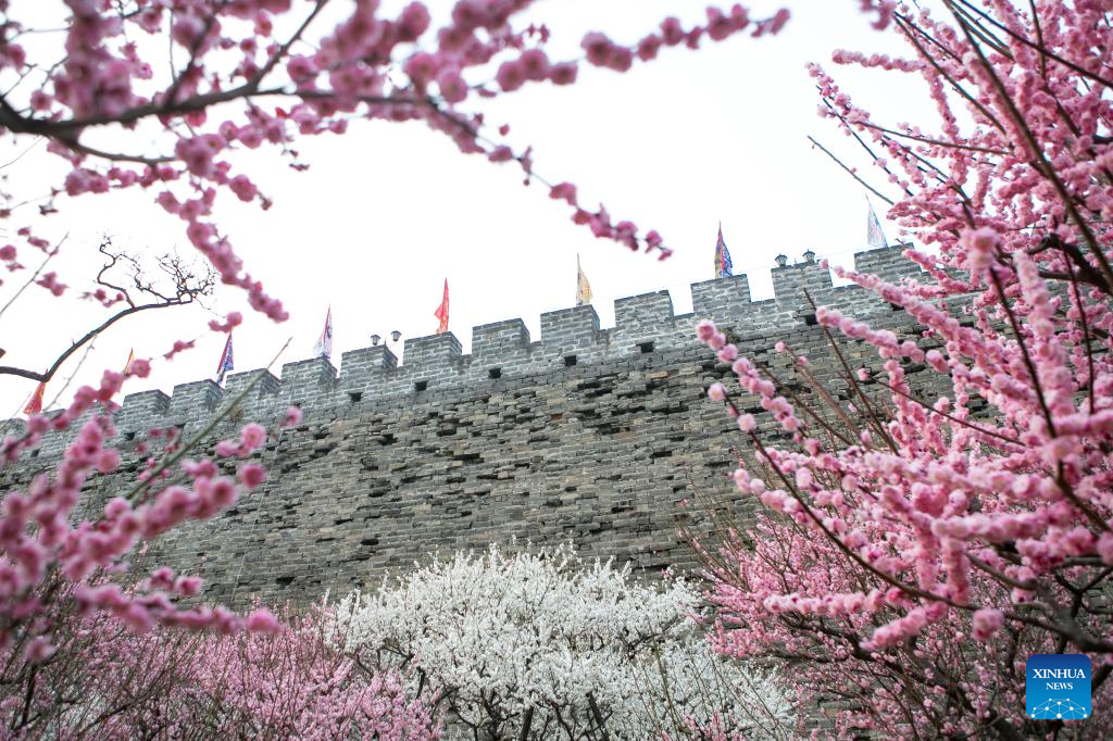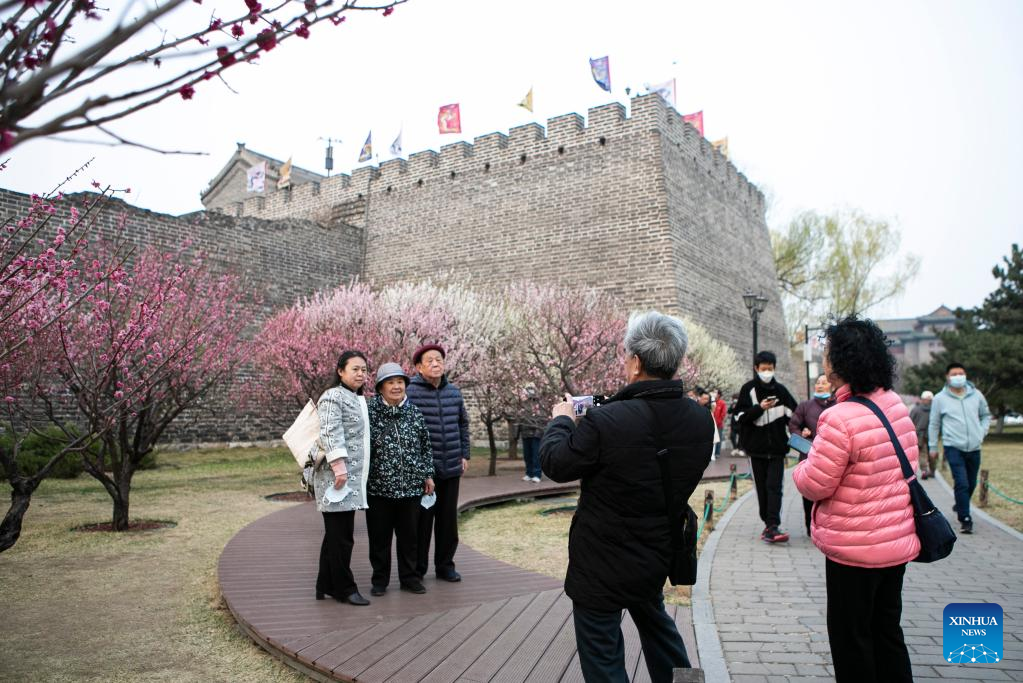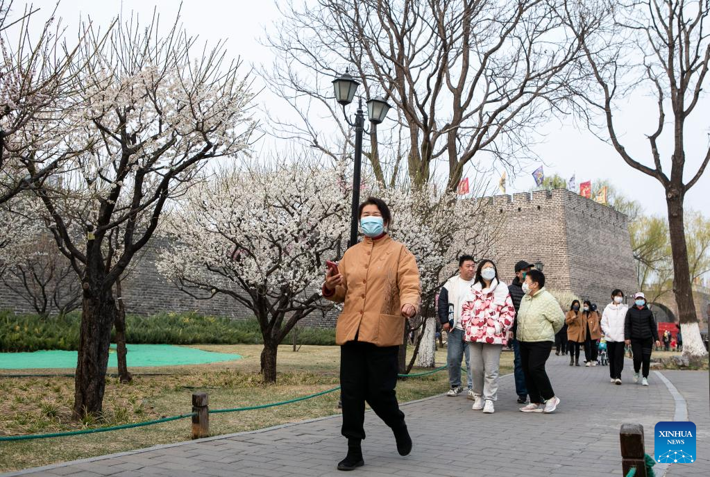 This photo taken on March 19, 2023 shows blooming flowers at the Ming City Wall Site Park in Beijing, capital of China. Blooming flowers have attracted many tourists to the park recently. (Xinhua/Zhang Fan)