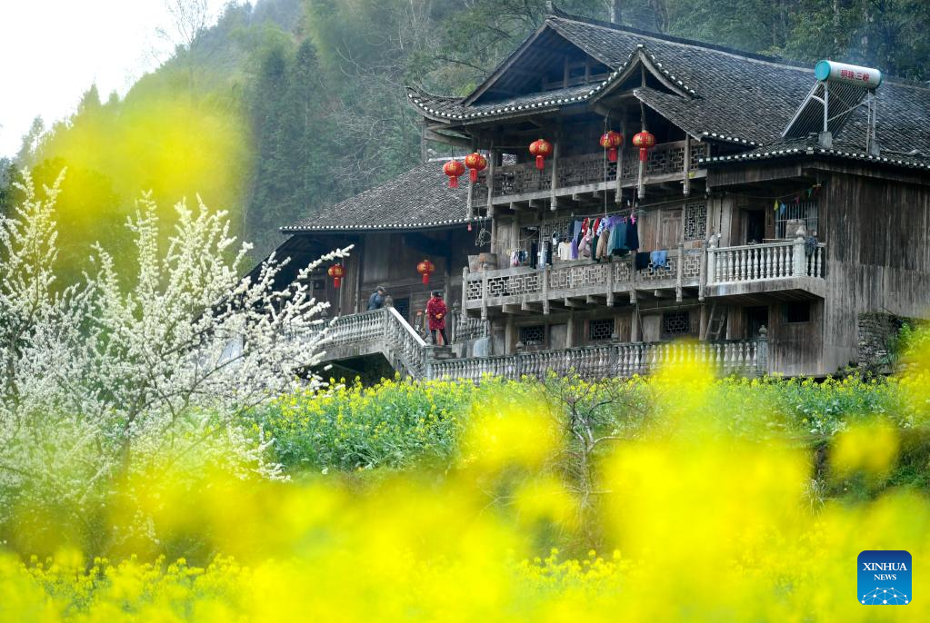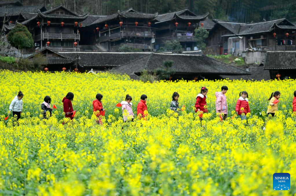 Children walk among cole flower fields in front of Diaojiaolou buildings (houses on stilts) in Xuanen County, central China's Hubei Province, March 18, 2023. (Photo by Chen Xukai/Xinhua)