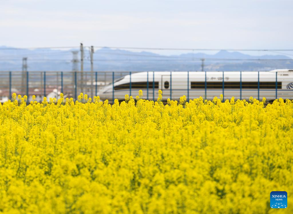 This photo taken on March 17, 2023 shows a high-speed train running past a cole flower field in Yangxian County of Hanzhong City, northwest China's Shaanxi Province. As the temperature gradually rises, the cole flowers in full bloom have attracted many tourists to Hanzhong. In recent years, the rural revitalization of Hanzhong has been greatly promoted by the development of ecological agriculture and tourism. (Photo by Zou Jingyi/Xinhua)