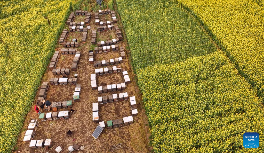 This aerial photo taken on March 16, 2023 shows beehives among cole flower fields in Yangxian County of Hanzhong City, northwest China's Shaanxi Province. As the temperature gradually rises, the cole flowers in full bloom have attracted many tourists to Hanzhong. In recent years, the rural revitalization of Hanzhong has been greatly promoted by the development of ecological agriculture and tourism. (Photo by Zou Jingyi/Xinhua)