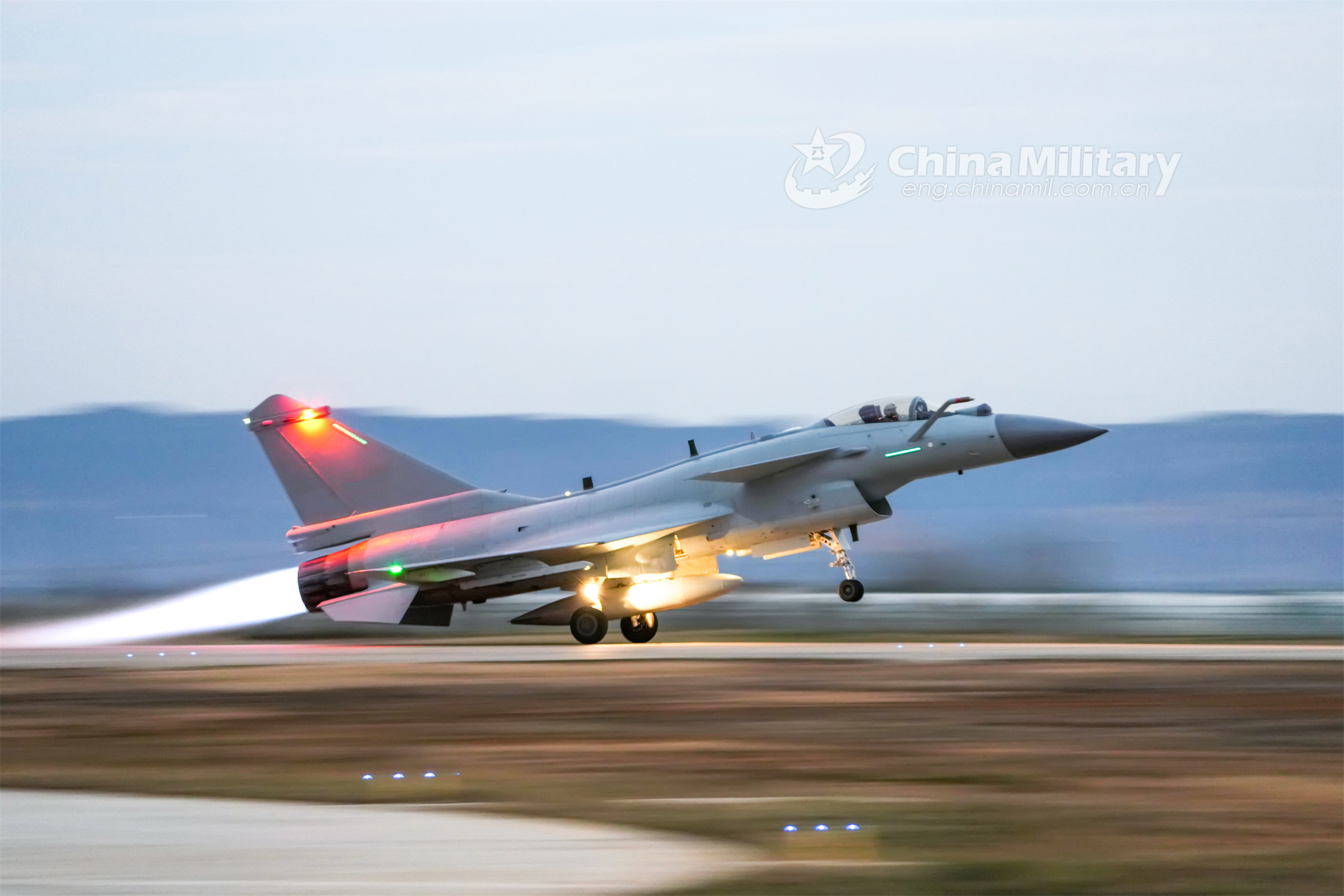 A J-10 fighter jet attached to an aviation brigade of the air force under the PLA Southern Theater Command takes off from the runway while gaining speed during a 24-hour flight training exercise recently. (eng.chinamil.com.cn/Photo by Wang Guoyun)