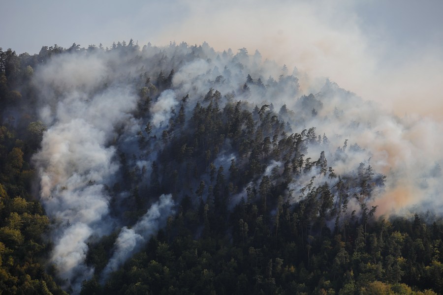 Photo taken on Aug. 24, 2022 shows a fire site in the forest area of the central resort town of Borjomi, Georgia. (Photo by Tamuna Kulumbegashvili/Xinhua)