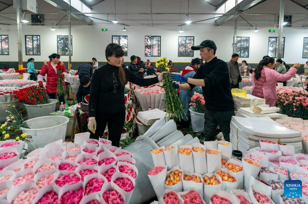 Workers pack flowers at the Dounan Flower Market in Kunming, southwest China's Yunnan Province, Jan. 31, 2023. (Xinhua/Chen Xinbo)