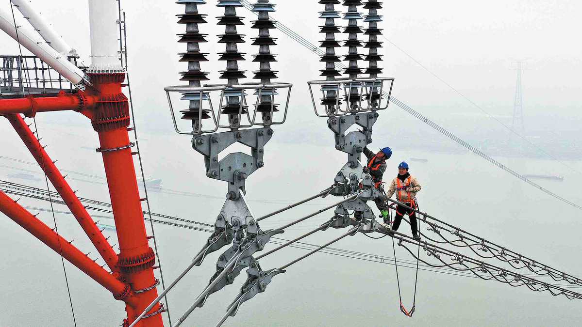 Technicians inspect cables on a power transmission tower sitting across the Yangtze River and connecting Wuxi and Taizhou in Jiangsu province in February. SHI JUN/FOR CHINA DAILY