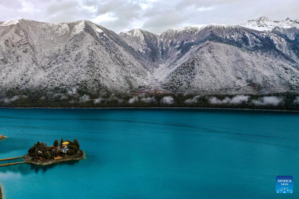 This aerial photo taken on March 19, 2023 shows the scenery of Basum Lake after snow in the city of Nyingchi, southwest China's Tibet Autonomous Region. (Xinhua/Jiang Fan)