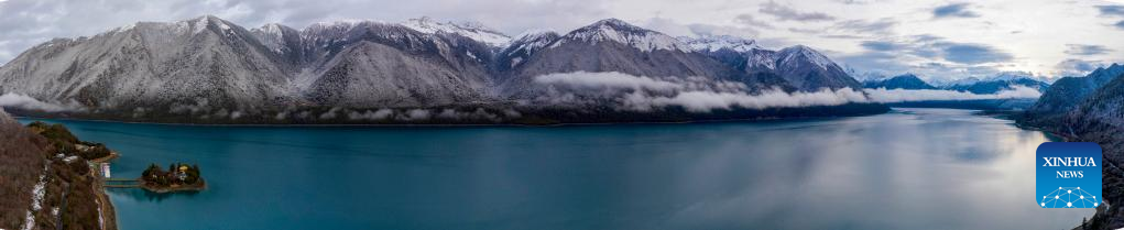 This stitched aerial photo taken on March 19, 2023 shows the scenery of Basum Lake after snow in the city of Nyingchi, southwest China's Tibet Autonomous Region. (Xinhua/Jiang Fan)