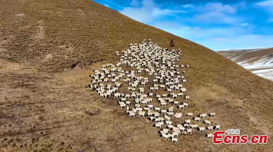 Livestock are on their journey to a spring pasture at Bayingol Mongolian Autonomous Prefecture, northwest China's Xingjiang Uygur Autonomous Region. (Photo: China News Service/Gan Minglian)