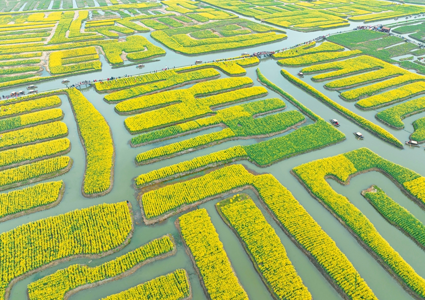 Rapeseed flowers at the Qianduo scenic spot in Xinghua, east China’s Jiangsu Province, recently came into blossom. The boundless expanse of rapeseed flowers, scattered on duotian, a type of field landscape formed by raising mud into small stacks in waters, presents a picturesque spring scenery, attracting hordes of visitors.