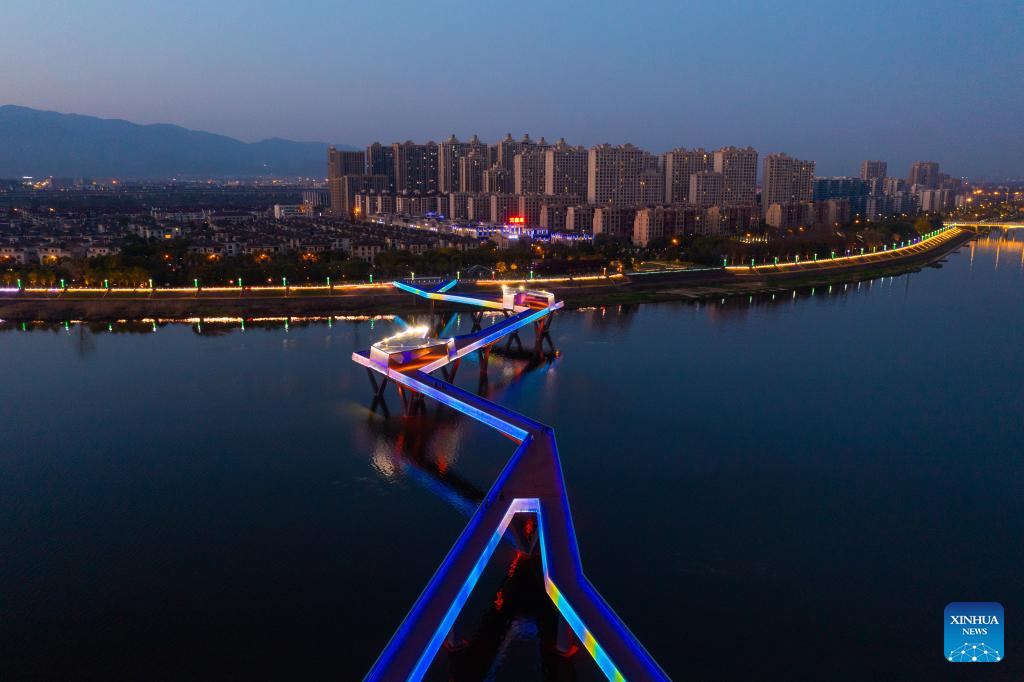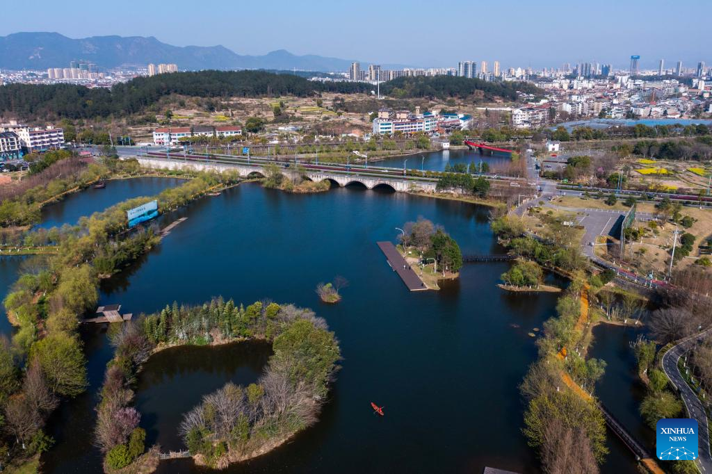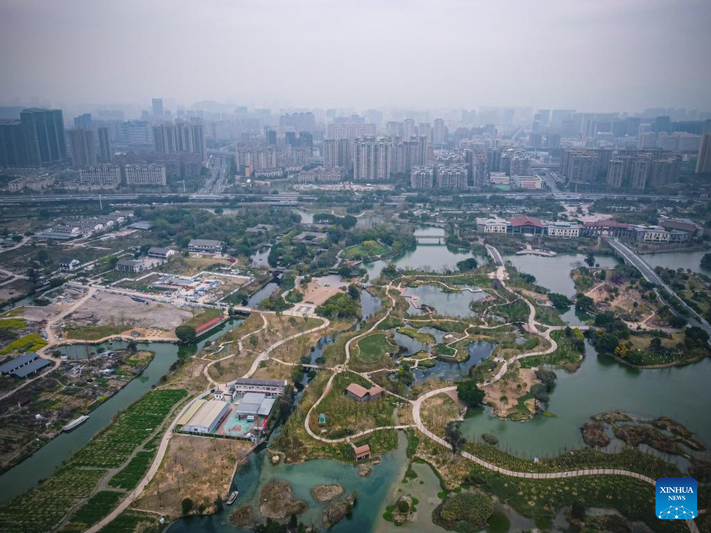 This aerial photo taken on March 16, 2023 shows the view of Sanyang wetland in Wenzhou, east China's Zhejiang Province. Zhejiang Province has been taking water environment management as top priority in ecological construction, elevating the water quality of hundreds of lakes and rivers and establishing waterfront civic activity sites. (Xinhua/Jiang Han)