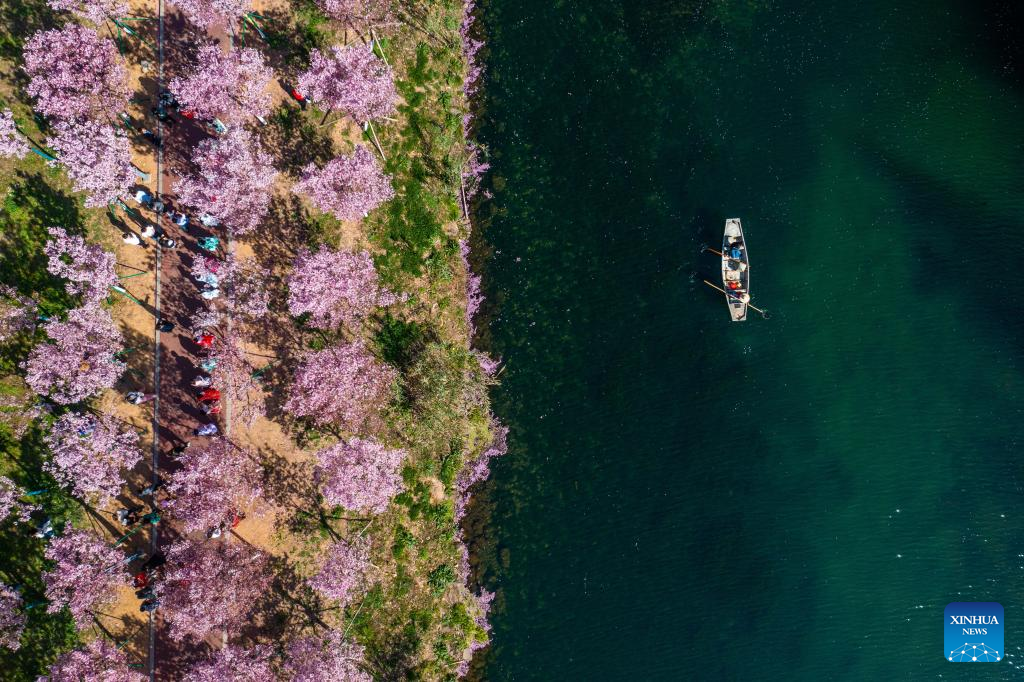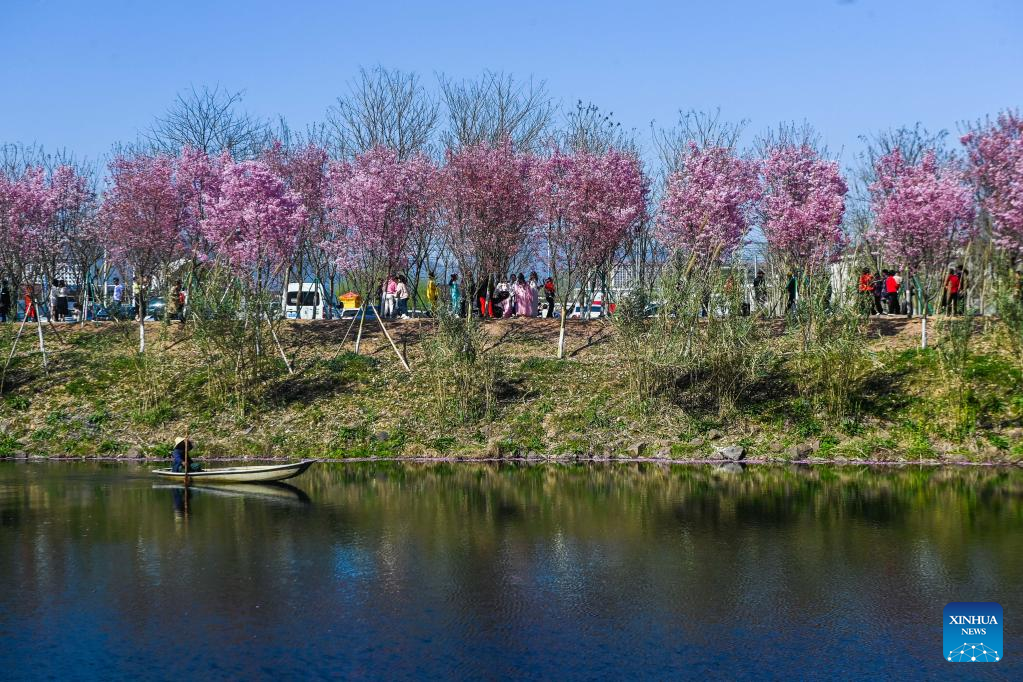 Visitors enjoy the view of blooming cherry flowers while a worker is cleaning the water surface on a section of Puyang river in Pujiang County of Jinhua, east China's Zhejiang Province, March 14, 2023. Zhejiang Province has been taking water environment management as top priority in ecological construction, elevating the water quality of hundreds of lakes and rivers and establishing waterfront civic activity sites. (Xinhua/Xu Yu)