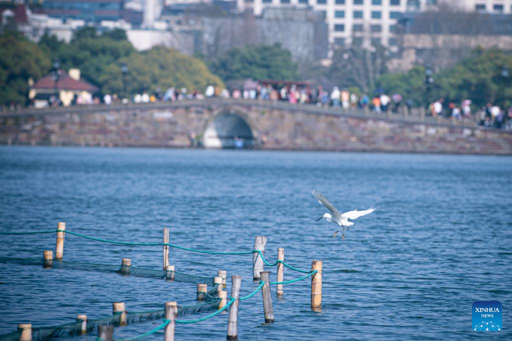 A bird flies over the West Lake in Hangzhou, east China's Zhejiang Province, March 15, 2023. Zhejiang Province has been taking water environment management as top priority in ecological construction, elevating the water quality of hundreds of lakes and rivers and establishing waterfront civic activity sites. (Xinhua/Jiang Han)