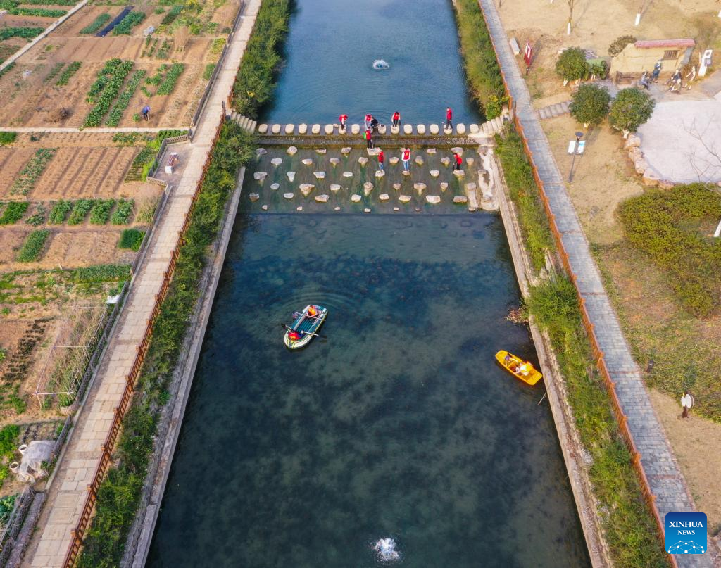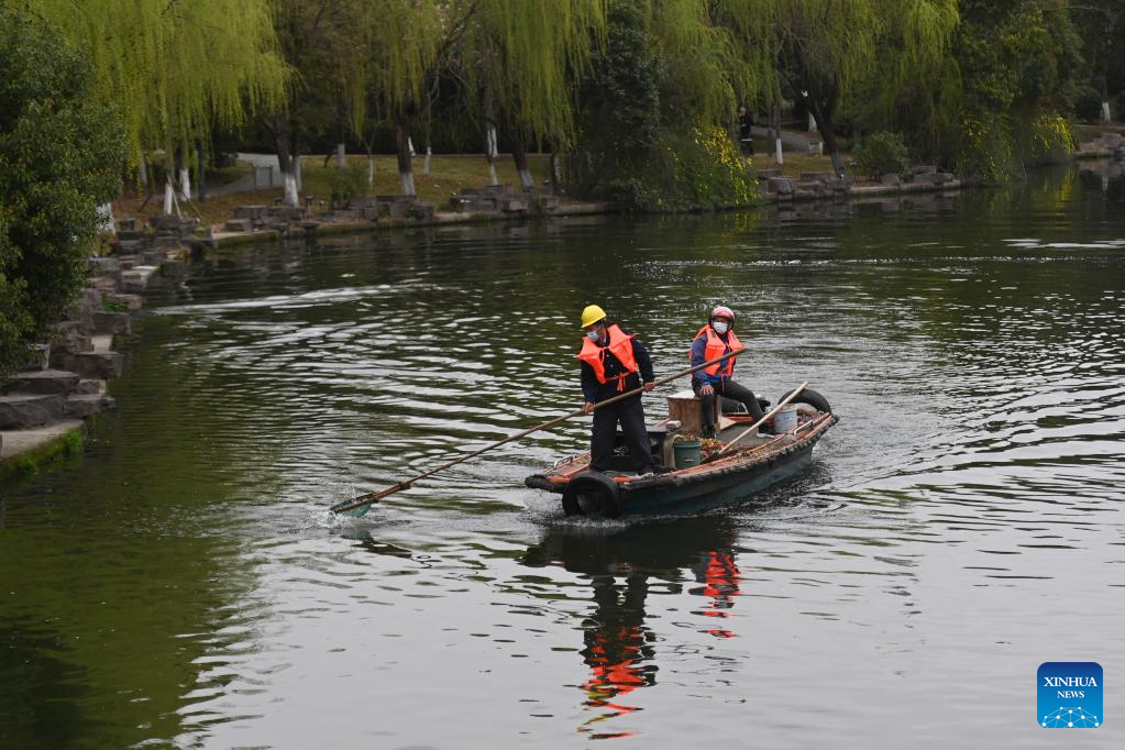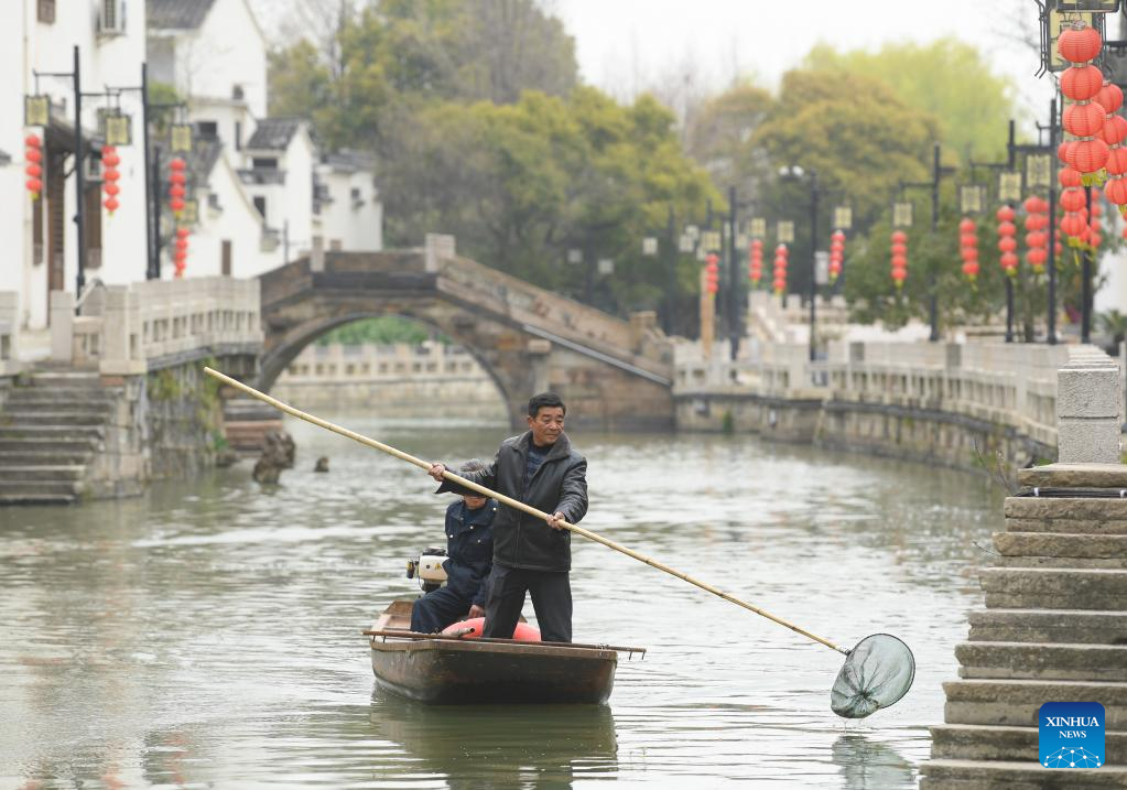 Workers clean the water surface on a creek in Zhili Town of Huzhou, east China's Zhejiang Province, March 16, 2023. Zhejiang Province has been taking water environment management as top priority in ecological construction, elevating the water quality of hundreds of lakes and rivers and establishing waterfront civic activity sites. (Xinhua/Weng Xinyang)