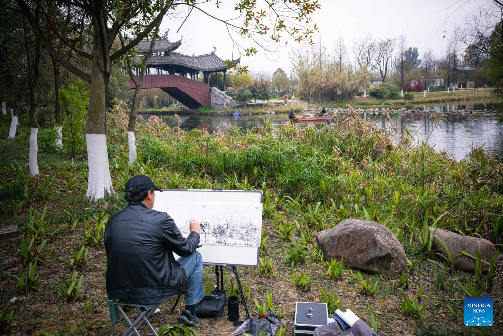 A man sketches at Sanyang wetland in Wenzhou, east China's Zhejiang Province, March 16, 2023. Zhejiang Province has been taking water environment management as top priority in ecological construction, elevating the water quality of hundreds of lakes and rivers and establishing waterfront civic activity sites. (Xinhua/Jiang Han)