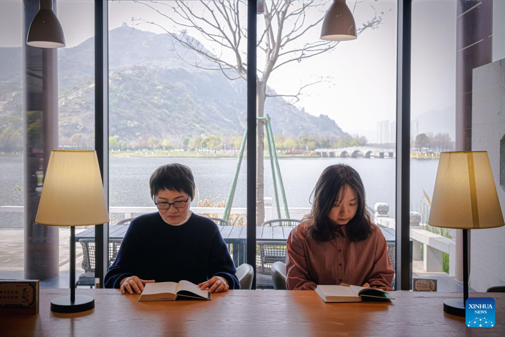 People read books at a bookstore beside a river in Leqing, east China's Zhejiang Province, March 17, 2023. Zhejiang Province has been taking water environment management as top priority in ecological construction, elevating the water quality of hundreds of lakes and rivers and establishing waterfront civic activity sites. (Xinhua/Jiang Han)