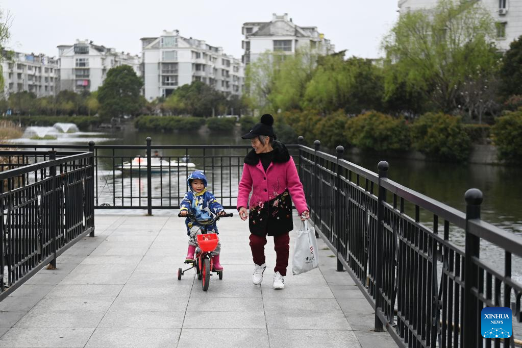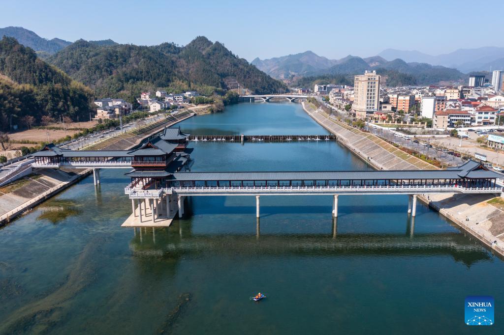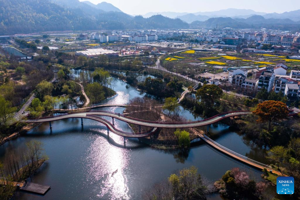 This aerial photo taken on March 15, 2023 shows the view of a park surrounded by Songyin river in Songyang County of Lishui, east China's Zhejiang Province. Zhejiang Province has been taking water environment management as top priority in ecological construction, elevating the water quality of hundreds of lakes and rivers and establishing waterfront civic activity sites. (Xinhua/Xu Yu)