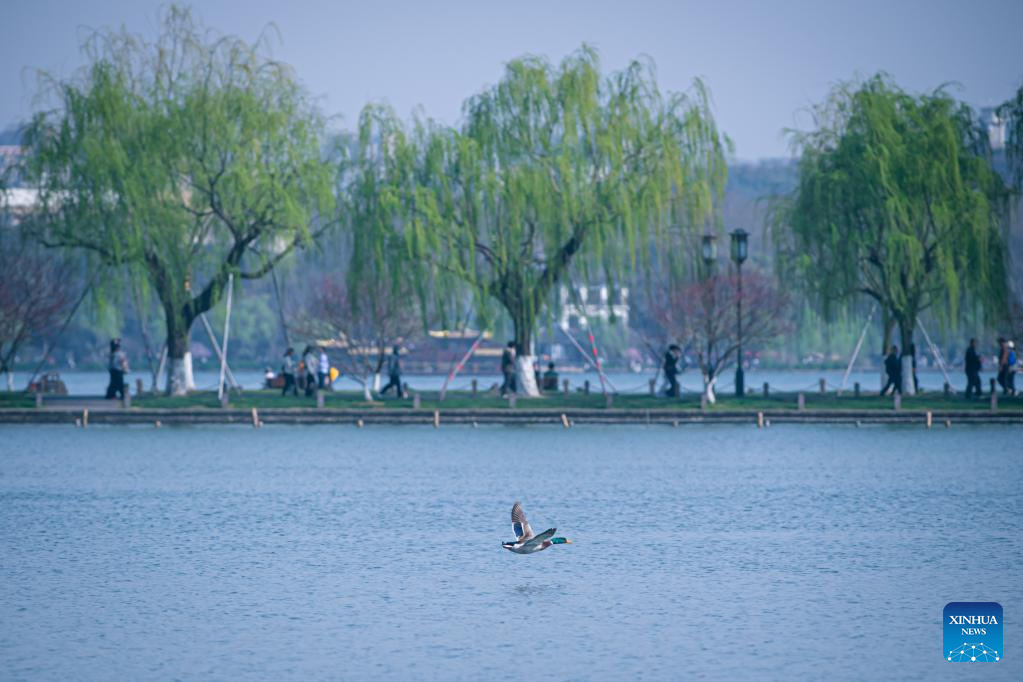 A wild duck flies over the West Lake in Hangzhou, east China's Zhejiang Province, March 15, 2023. Zhejiang Province has been taking water environment management as top priority in ecological construction, elevating the water quality of hundreds of lakes and rivers and establishing waterfront civic activity sites. (Xinhua/Jiang Han)