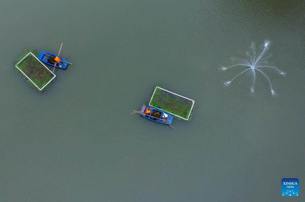 This aerial photo taken on March 16, 2023 shows workers cleaning a water surface in Changxing County of Huzhou, east China's Zhejiang Province. Zhejiang Province has been taking water environment management as top priority in ecological construction, elevating the water quality of hundreds of lakes and rivers and establishing waterfront civic activity sites. (Xinhua/Xu Yu)