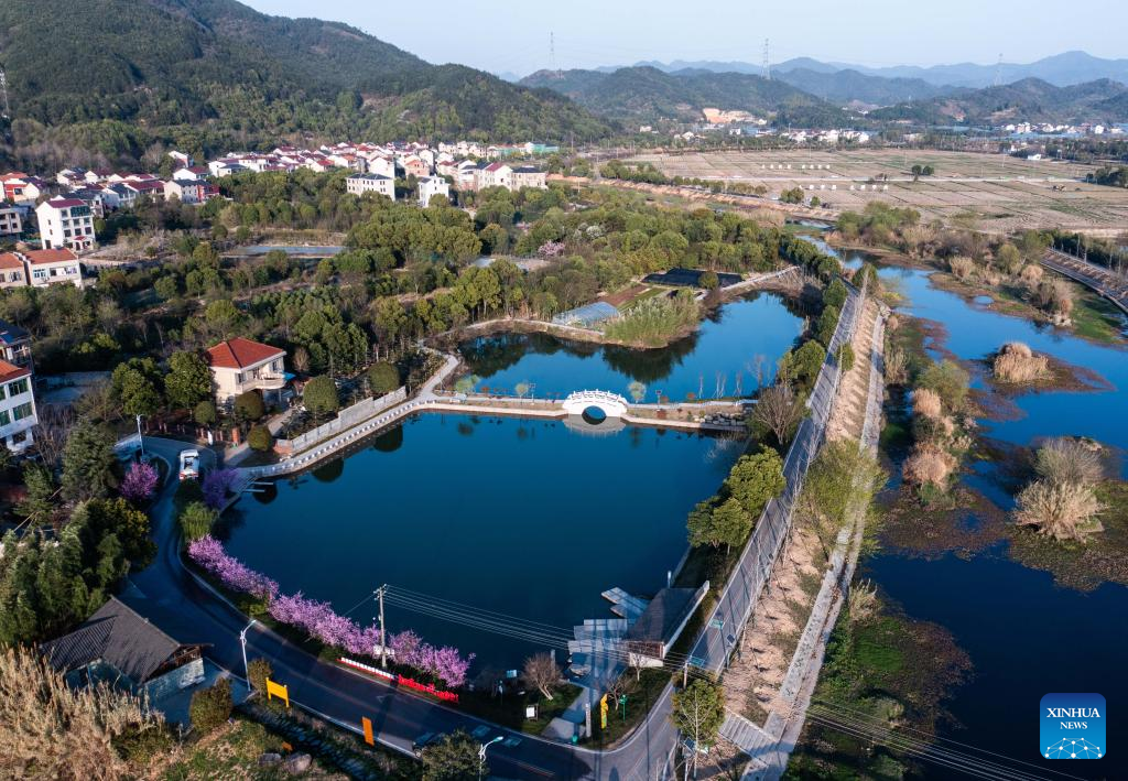 This aerial photo taken on March 14, 2023 shows a view of Cuihu lake in Pujiang County of Jinhua, east China's Zhejiang Province. Zhejiang Province has been taking water environment management as top priority in ecological construction, elevating the water quality of hundreds of lakes and rivers and establishing waterfront civic activity sites. (Xinhua/Xu Yu)