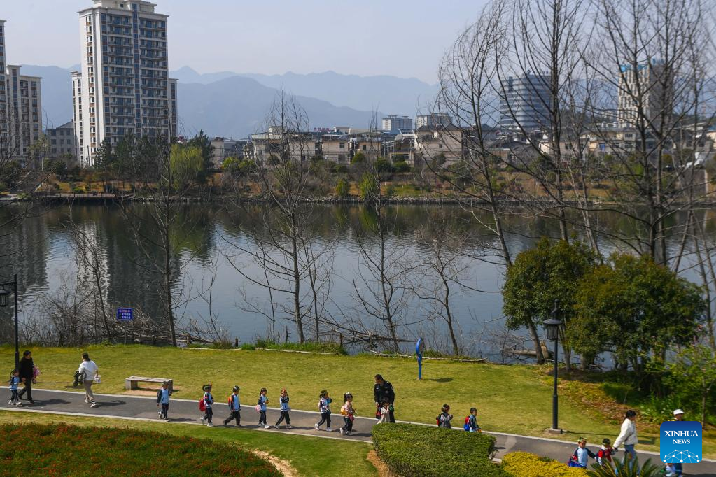 Children have fun during a spring outing at a park surrounded by Songyin river in Songyang County of Lishui, east China's Zhejiang Province, March 15, 2023. Zhejiang Province has been taking water environment management as top priority in ecological construction, elevating the water quality of hundreds of lakes and rivers and establishing waterfront civic activity sites. (Xinhua/Xu Yu)
