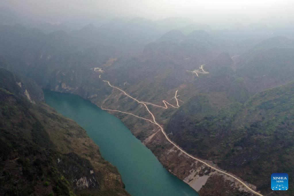 This aerial photo taken on March 20, 2023 shows Hongshui River, the water source of the drought resisting emergency water supply project in Bahao Village in Bansheng Township, Dahua Yao Autonomous County, south China's Guangxi Zhuang Autonomous Region. (Xinhua/Huang Xiaobang)