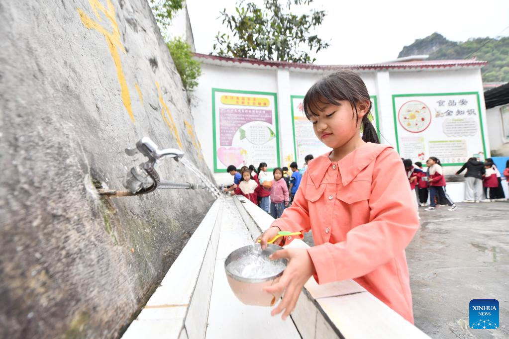 This photo taken on March 20, 2023 shows a girl washing her bowl with tap water at Bahao elementary school in Bansheng Township, Dahua Yao Autonomous County, south China's Guangxi Zhuang Autonomous Region. (Xinhua/Huang Xiaobang)
