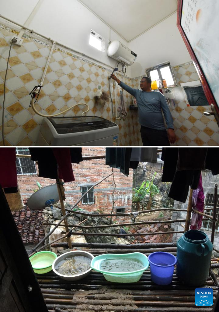 This combined photo shows villager Lan Caihong displaying a water heater and a laundry machine installed at his home in Nongyong Village of Bansheng Township, Dahua Yao Autonomous County, south China's Guangxi Zhuang Autonomous Region (Top, taken on Jan. 21, 2023) and villager Lan Caihong collecting rainwater with buckets and pots under his roof at his home in Nongyong Village (taken on Feb. 14, 2015) . (Xinhua/Huang Xiaobang)