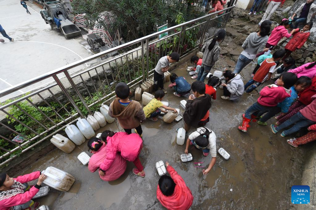 This photo taken on Nov. 24, 2014 shows pupils washing and cooking rice with rainwater stored in plastic buckets at Bahao elementary school in Bansheng Township, Dahua Yao Autonomous County, south China's Guangxi Zhuang Autonomous Region. (Xinhua/Huang Xiaobang)